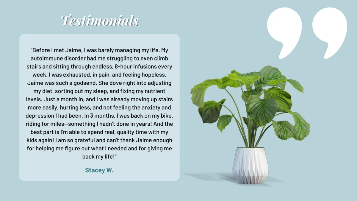 With over 20 years in nursing and 13+ years in functional medicine and nutrition, Jaime has helped women uncover the hidden clues behind fatigue, hormonal imbalances, digestive struggles, and stress. Through her work, she provides science-backed solutions to restore gut health, rebalance hormones, and rewire the nervous system for lasting vitality.